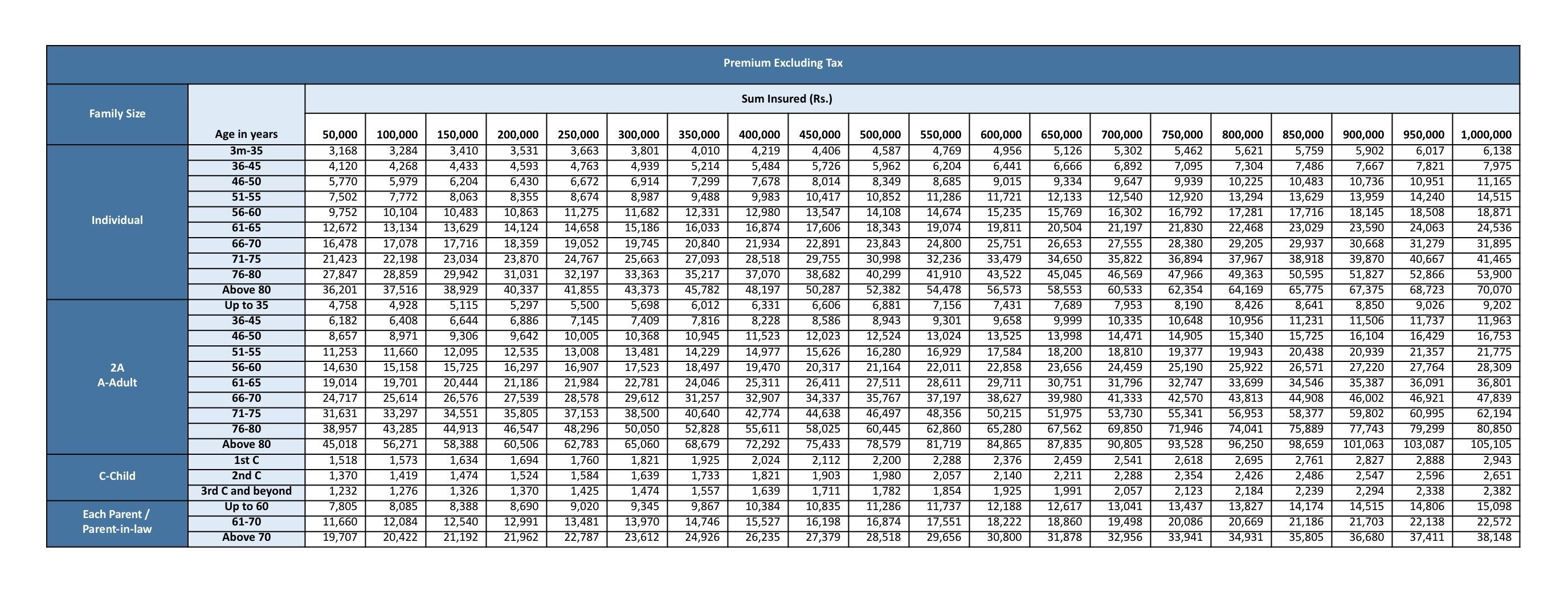 Sum InsuredThe policy provides the Sum Insured options ranging from Rs. 50,000/- to Rs. 10,00,000/- (in the multiples of Rs. 50,000/-). |
