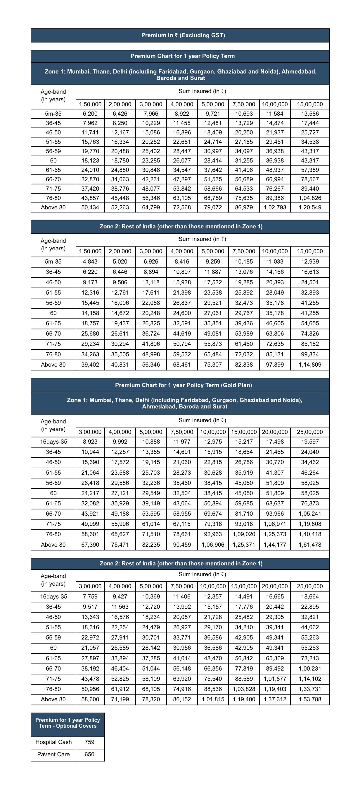 Family Package PlanAvailable for persons from 5 months to 45 years. The sum insured is apportioned equally among insured family members. |